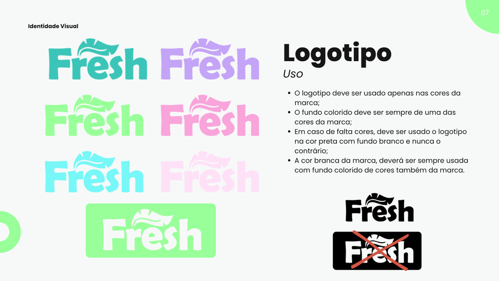 Criação do Logotipo, Ícones, Paleta de Cores, Tipografia e ideias de post nas redes sociais para a marca fict ícia de saúde bucal Fresh.